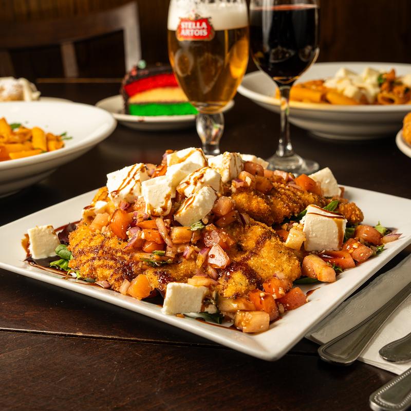 Sauteed in Marsala wine with mushrooms, topped with fried eggplant, prosciutto, tomatoes & mozzarella.